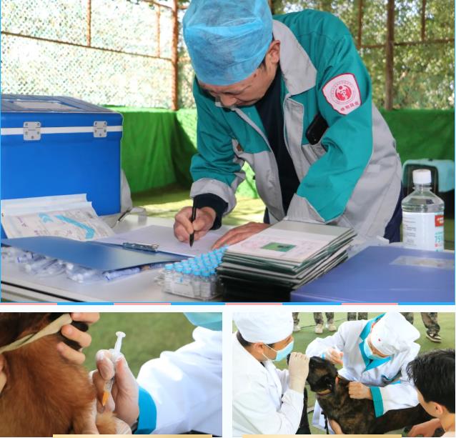 防疫队工作人员首先对犬只的健康状况进行了详细检查,确保工作犬身体处于适合接种疫苗的状态。随后,他们严格按照疫苗接种流程,为现场犬只逐一进行疫苗注射。