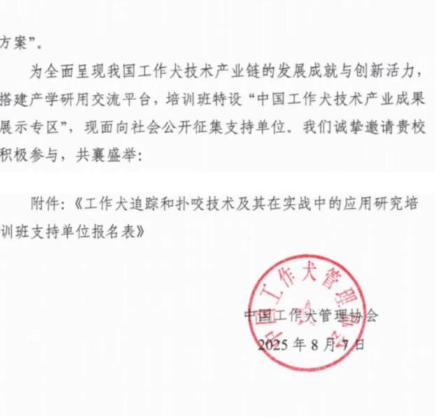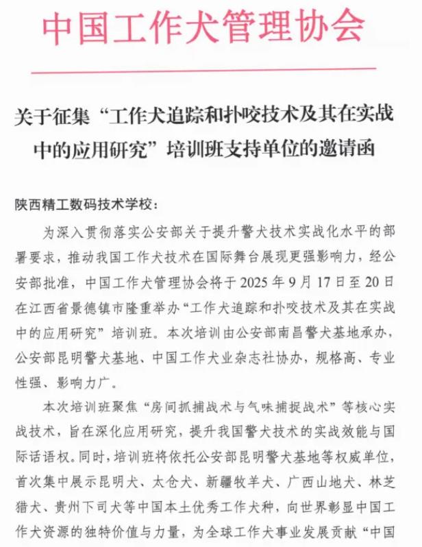 中国工作犬管理协会将于2025年9月17日至20日在江西省景德镇市隆重举办“工作犬追踪和扑咬技术及其在实战中的应用研究”培训班。本次培训规格高、专业性强、影响力广,我校荣幸受邀参加。